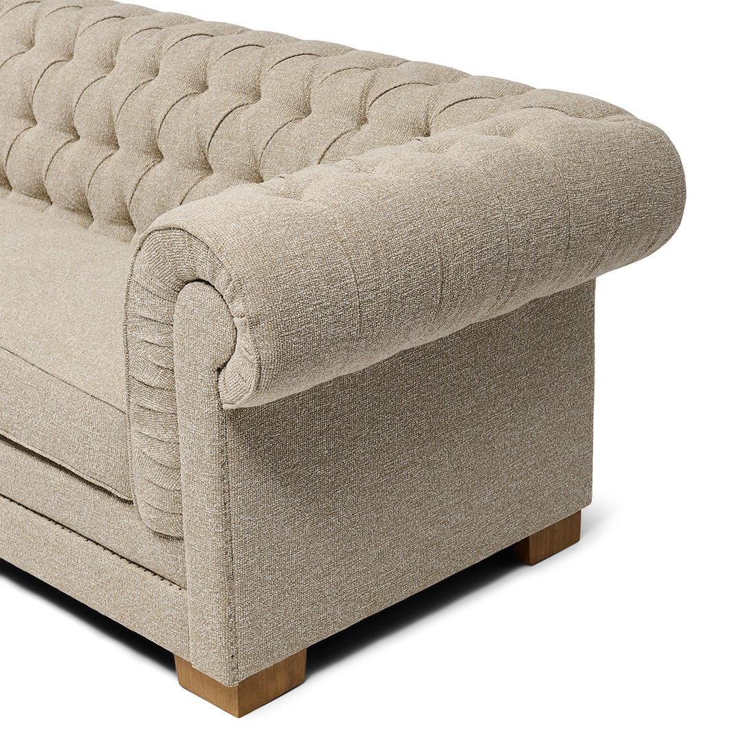 Model wyróżnia się efektownym pikowaniem typu chesterfield oraz zaokrąglonymi podłokietnikami, które podkreślają elegancki wygląd. Obicie stanowi tkanina strukturalna w kolorze piaskowego beżu, która dodaje głębi wizualnej i subtelnej tekstury. Stabilna konstrukcja oraz starannie wykończone detale gwarantują trwałość i estetykę na najwyższym poziomie.