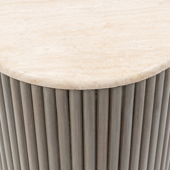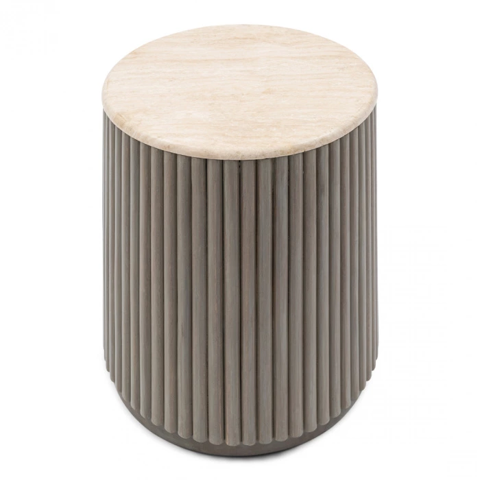 Stolik boczny Villanova to nie tylko piękny element dekoracyjny, ale również funkcjonalny mebel. Jego okrągły blat o średnicy 42 cm zapewnia wystarczającą przestrzeń na filiżankę kawy, książki czy dekoracje, a solidna podstawa z drewna mango gwarantuje stabilność i trwałość. Blat z trawertynu jest odporny na zarysowania i łatwy do utrzymania w czystości – wystarczy przetrzeć go suchą szmatką, aby zachować jego piękny wygląd na lata.