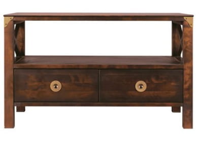 Szafka/stolik RTV w odcieniu kasztanowym, o wymiarach 89x50x56,5cm, idealnie wpisze się w aranżację wnętrza w stylu kolonialnym czy modern classic. Szafka posiada dwie szuflady, krzyżowane boki.