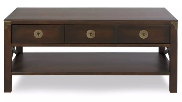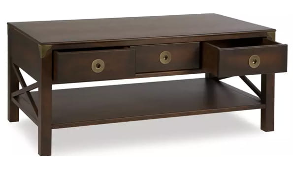 Stolik kawowy w odcieniu kasztanowym, o wymiarach 110x60x47cm, idealnie wpisze się w aranżację wnętrza w stylu kolonialnym czy modern classic. Stolik posiada trzy szuflady oraz dodatkową półkę.