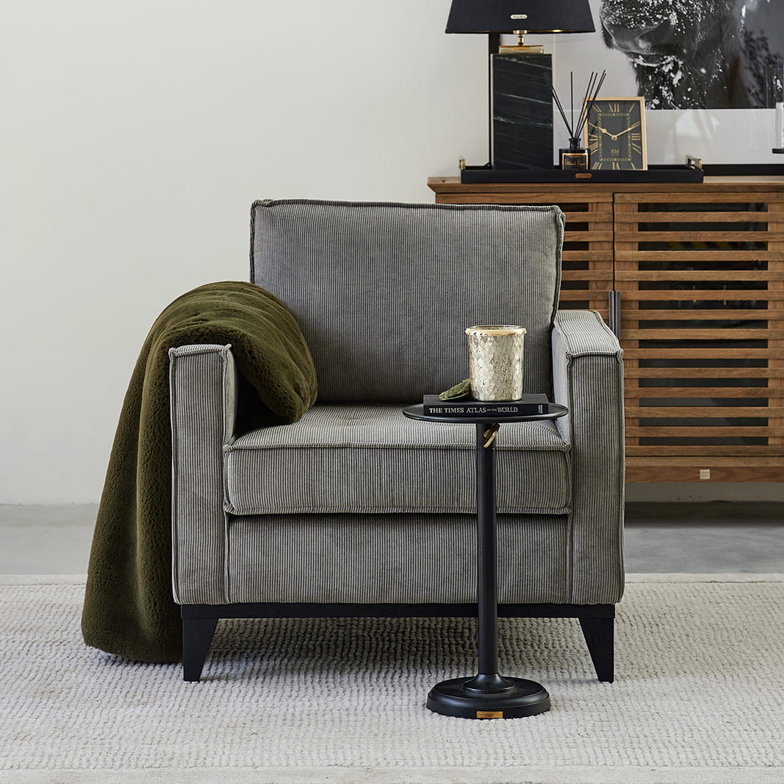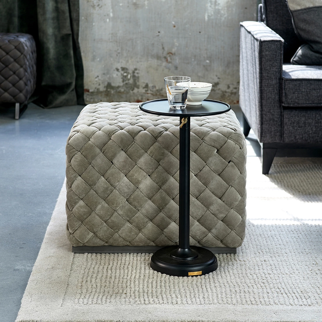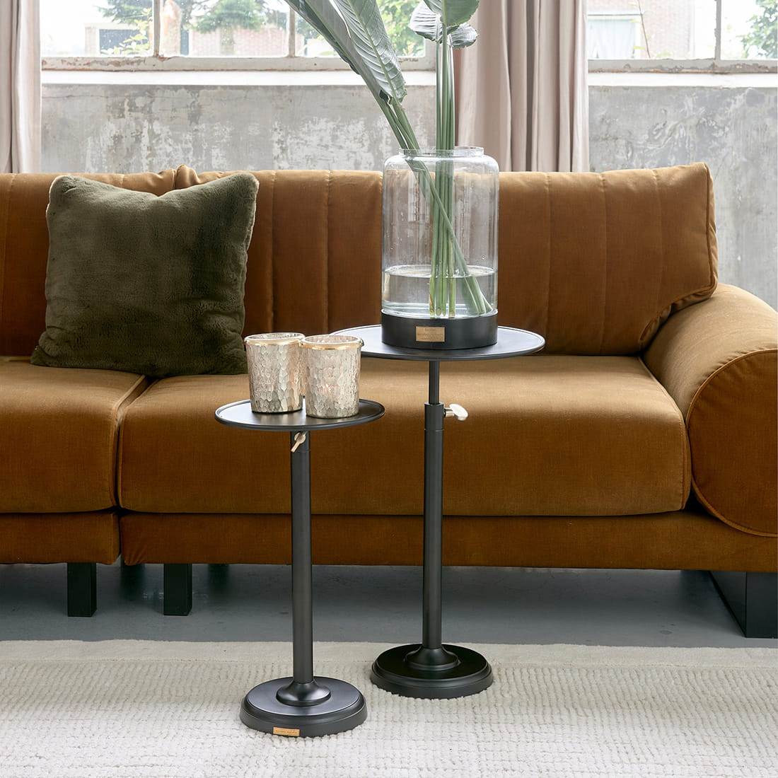 Stolik Venice został wykonany z wysokiej jakości aluminium, co czyni go wyjątkowo trwałym, a jednocześnie lekkim i łatwym do przestawiania. Czarna, matowa powłoka nadaje mu elegancji i subtelnej nowoczesności. Okrągły blat wsparty jest na regulowanej nodze z dekoracyjnym pokrętłem w kolorze mosiądzu, co dodaje charakteru i industrialnego uroku. Solidna podstawa zapewnia stabilność, niezależnie od miejsca, w którym zdecydujesz się go ustawić.