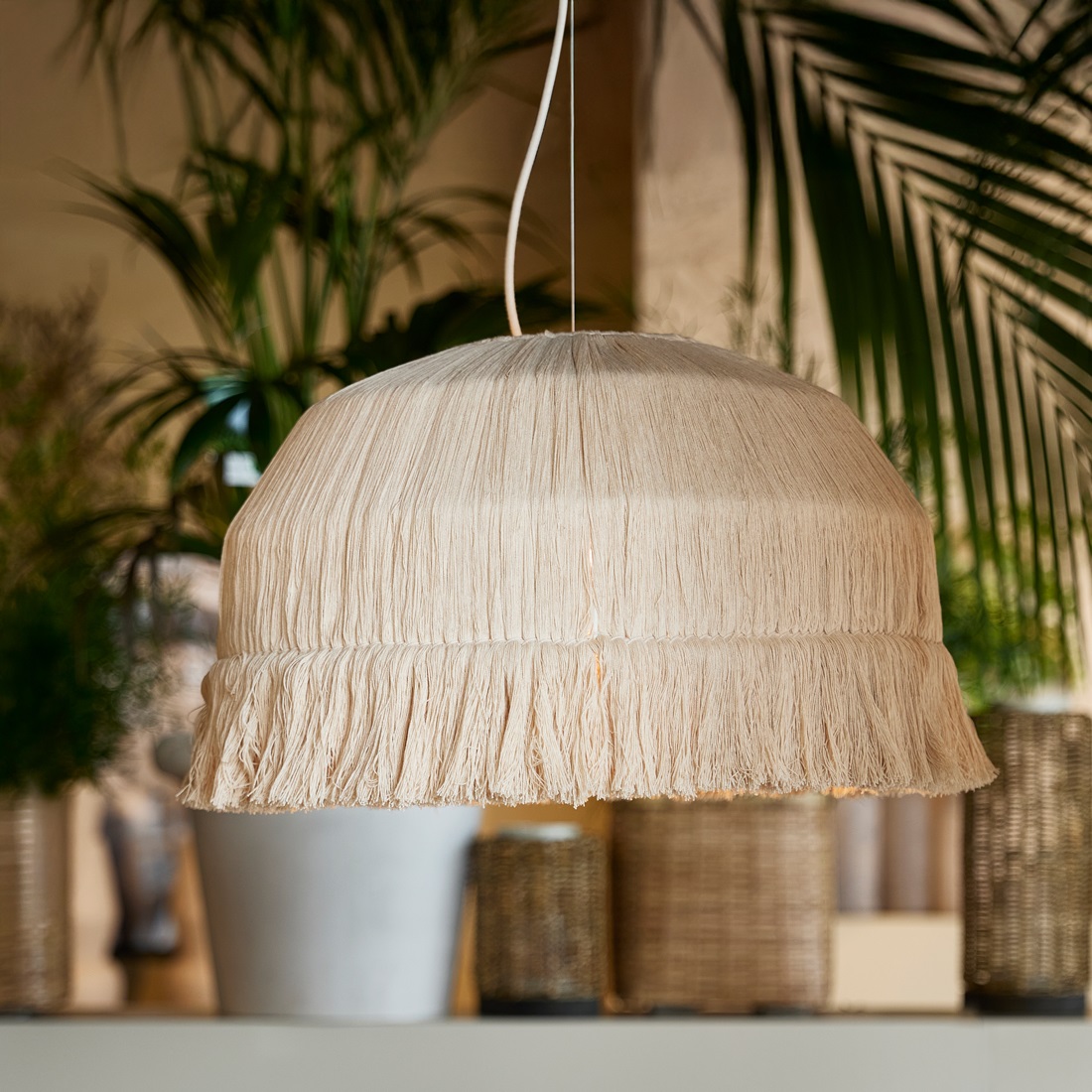 Klosz wykonany z bawełny w połączeniu z elementami z metalu tworzy harmonijną kompozycję inspirowaną naturą. Wymiary 55 x 55 x 36 cm pozwalają na efektowne wyeksponowanie lampy w centralnej części pomieszczenia. Dekoracyjne wykończenie w postaci miękkich frędzli nadaje całości unikalnego stylu i subtelnej lekkości.