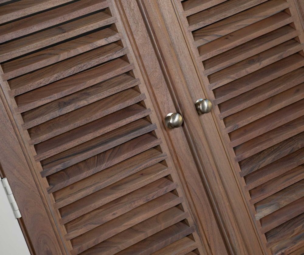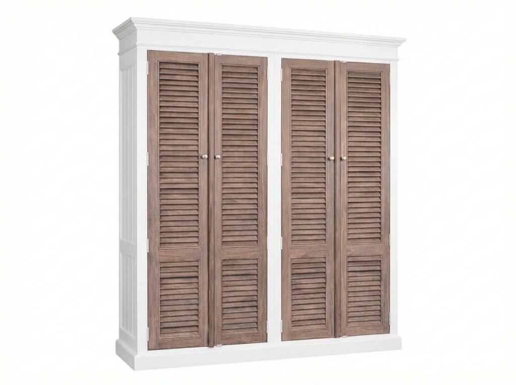 Korpus szafy wykonano z drewna akacjowego, wykończonego w kolorze bieli antycznej, co nadaje całości lekkiego, nadmorskiego charakteru. Drzwi żaluzjowe typu shutters powstały z drewna mango, którego piękne usłojenie i naturalne wybarwienie ociepla całość. Stylowe metalowe uchwyty harmonijnie dopełniają klasyczną formę. Szafa została ręcznie malowana, co sprawia, że każdy egzemplarz posiada swój unikalny charakter.