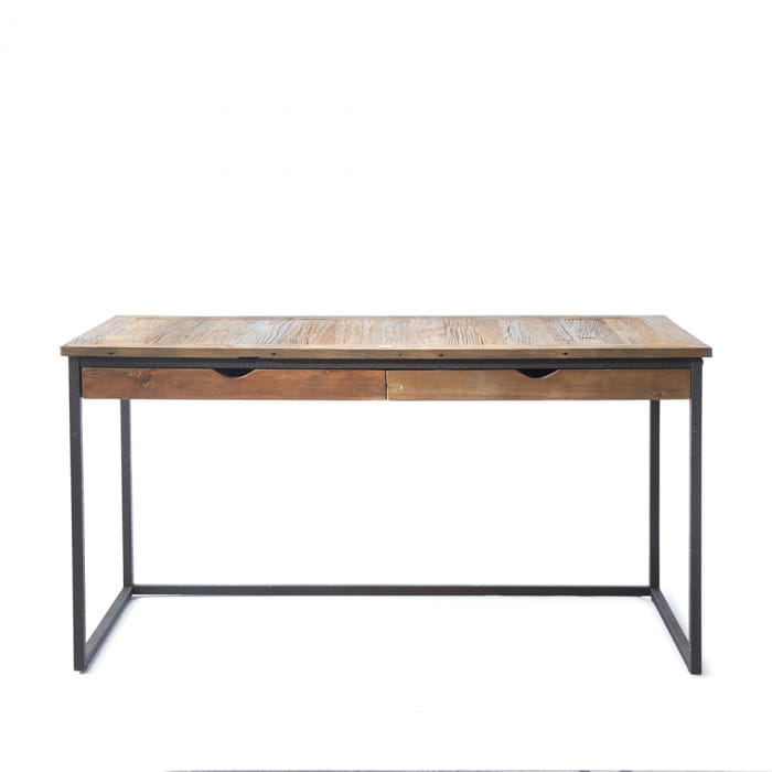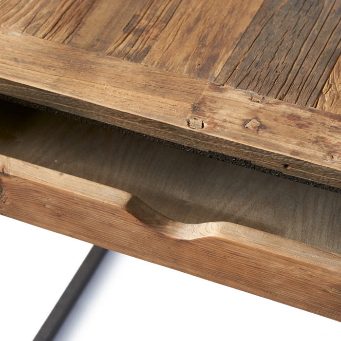 Blat biurka powstał z odzyskanego drewna wiązowego, które charakteryzuje się wyrazistą fakturą i nieregularnymi przetarciami. Te naturalne detale sprawiają, że każdy egzemplarz jest jedyny w swoim rodzaju i pełen charakteru. Żelazna rama w kolorze czarnym nadaje konstrukcji stabilności oraz podkreśla industrialny styl mebla. Delikatne ślady użytkowania drewna stanowią dowód na jego historię i dodają mu niepowtarzalnego uroku.