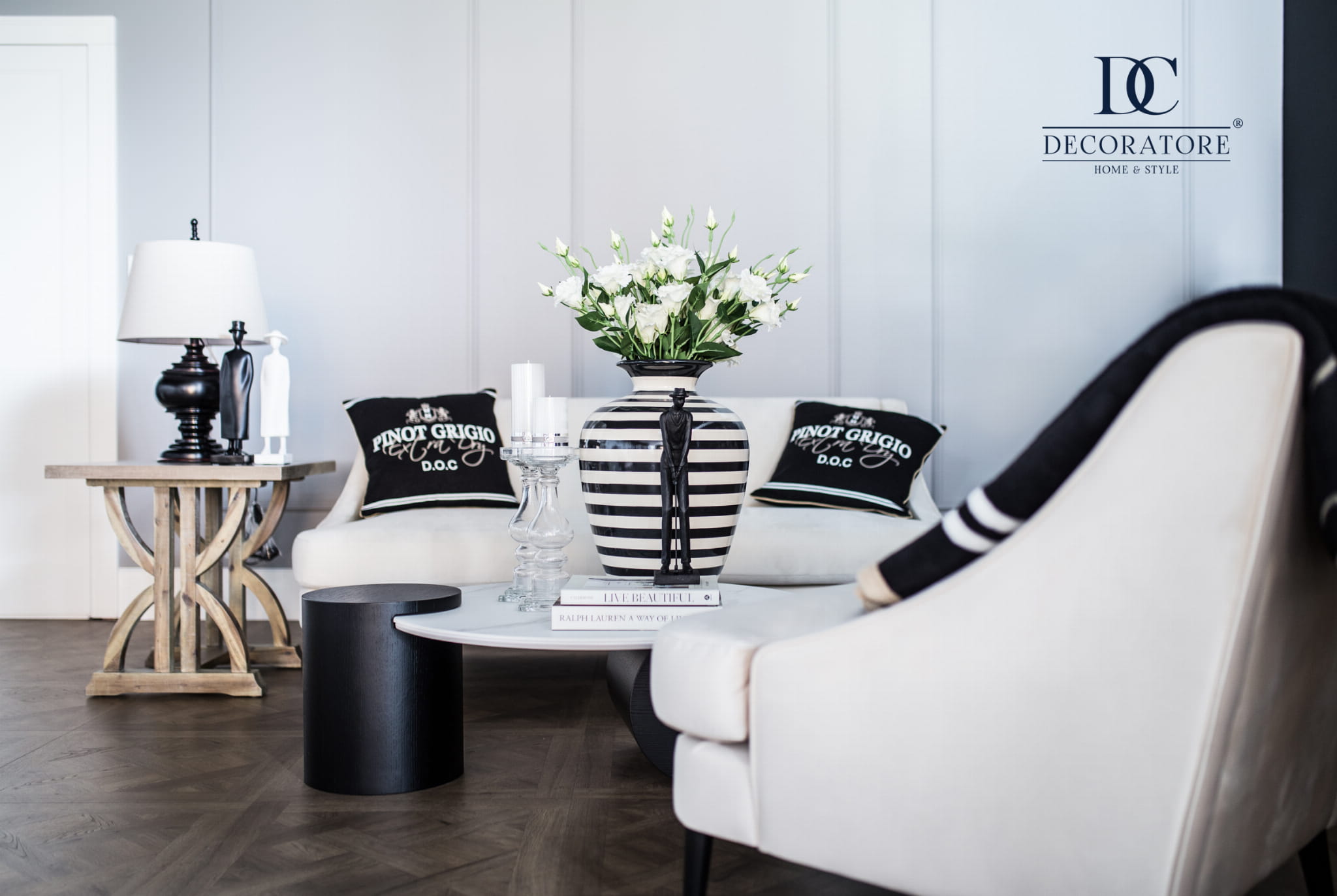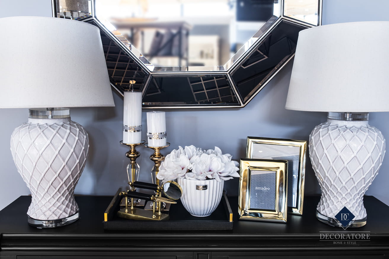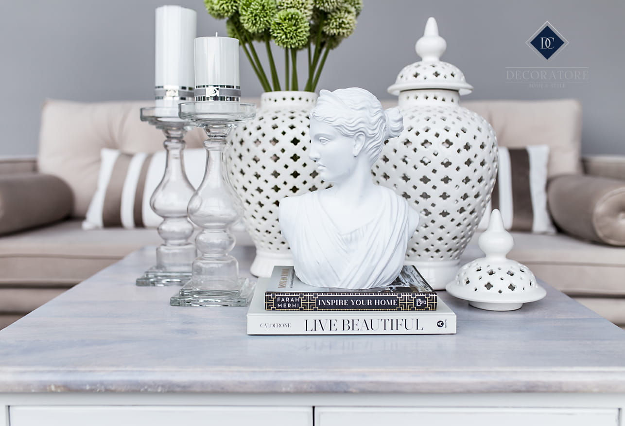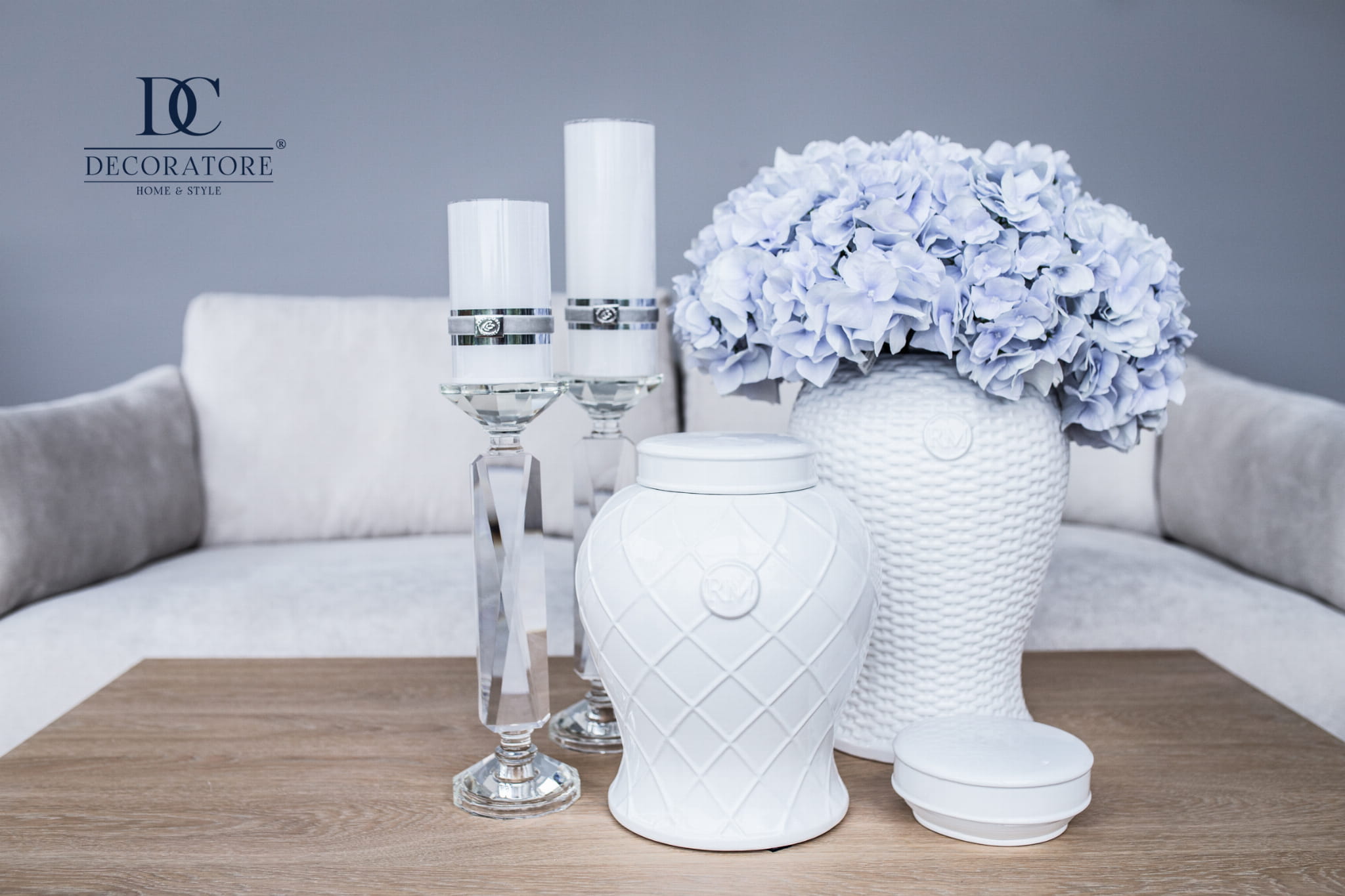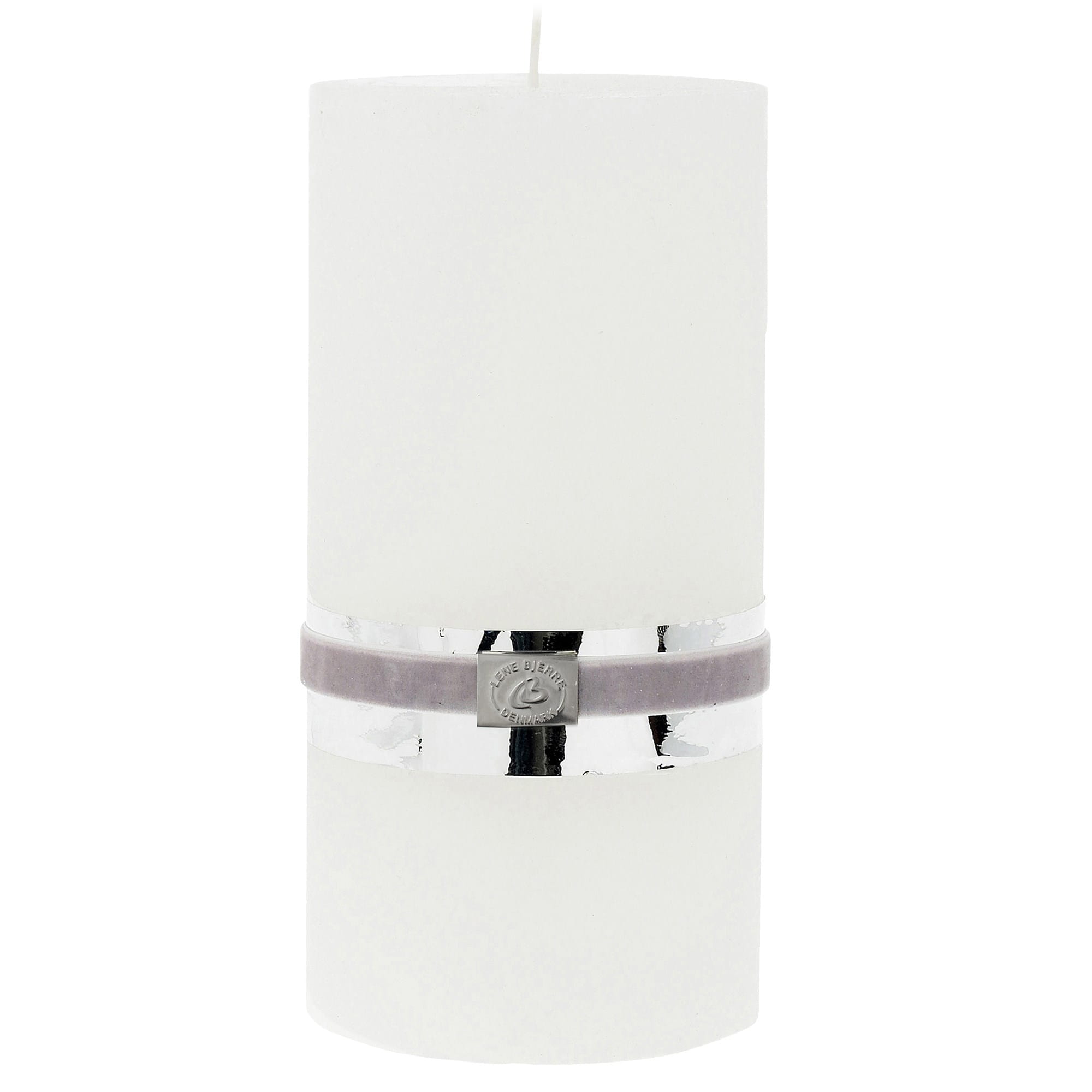 Świeca w kolorze białym, pięknie zdobiona aksamitną opaską ze srebrnym monogramem marki Lene Bjerre.