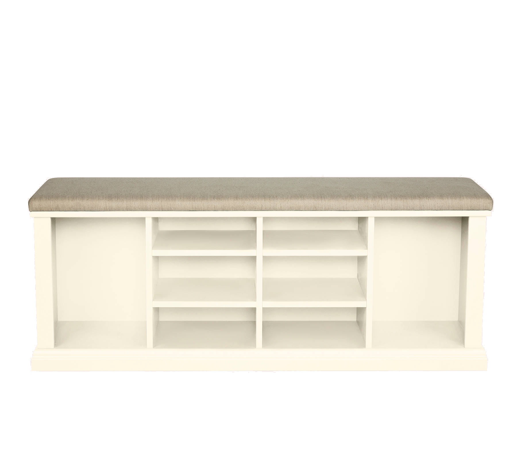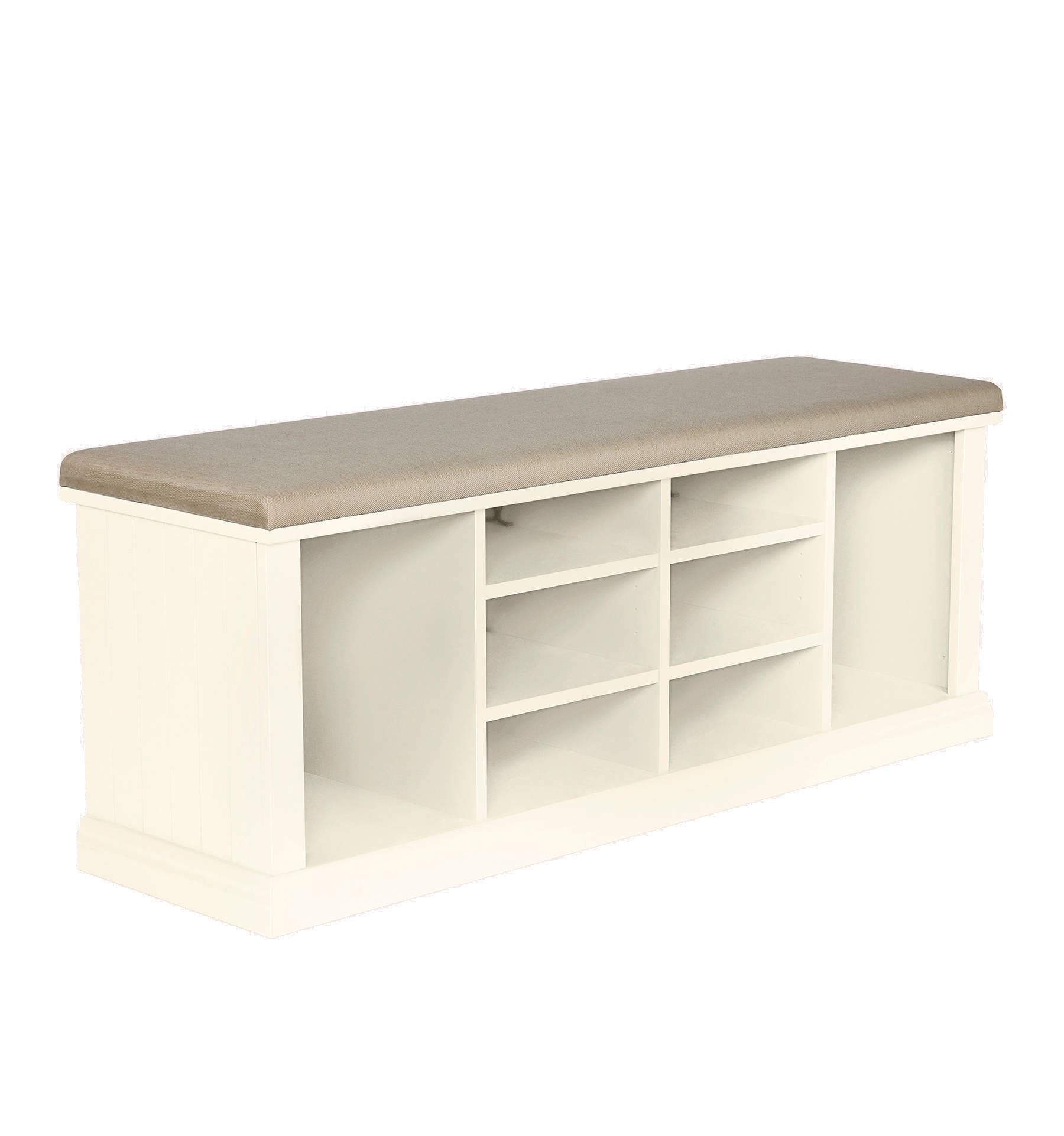 Szafka na buty w kolorze białym, z tapicerowanym siedziskiem, o wymiarach 120x46x55cm, posiada cztery półki oraz dwie wnęki na wysokie obuwie.