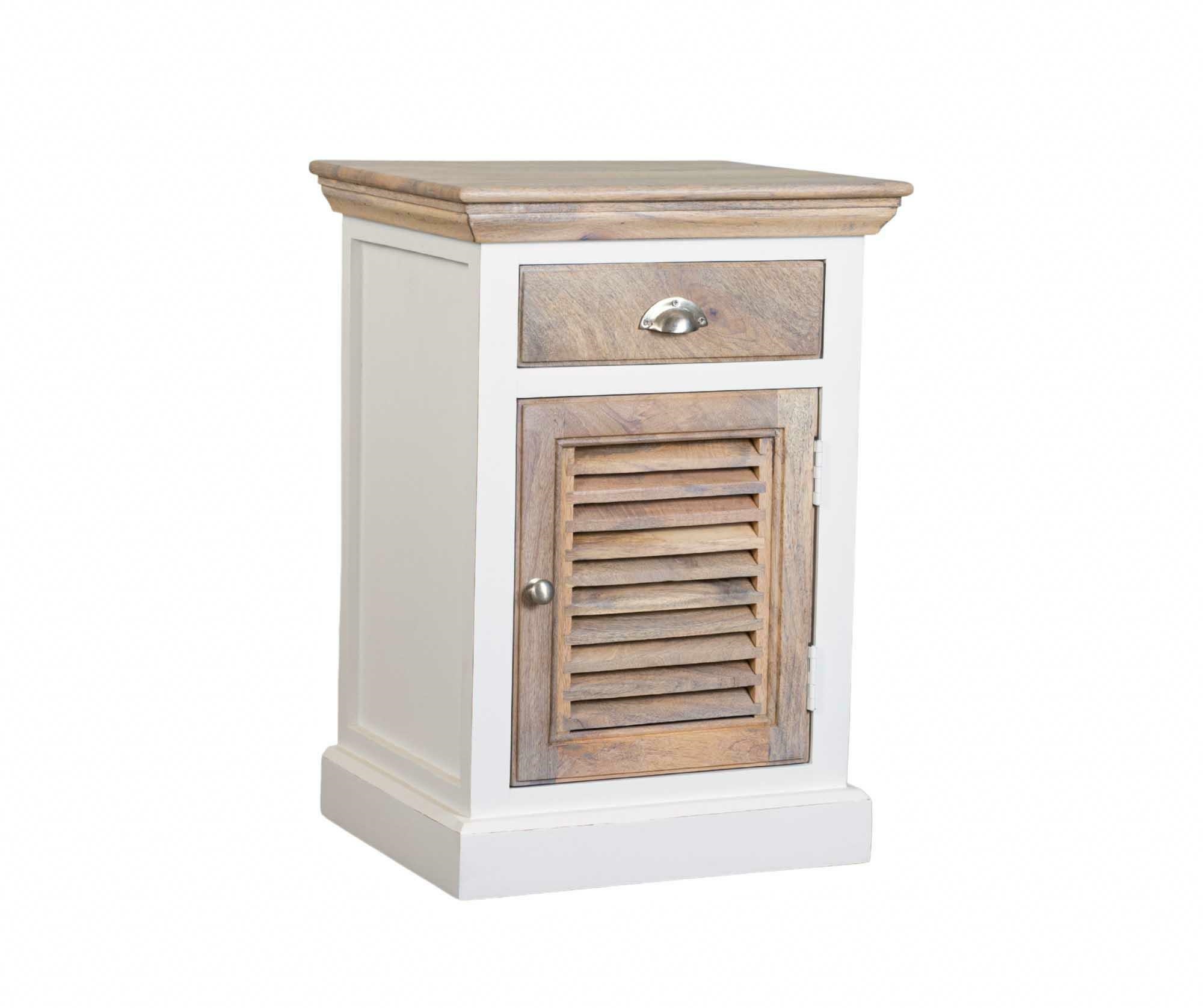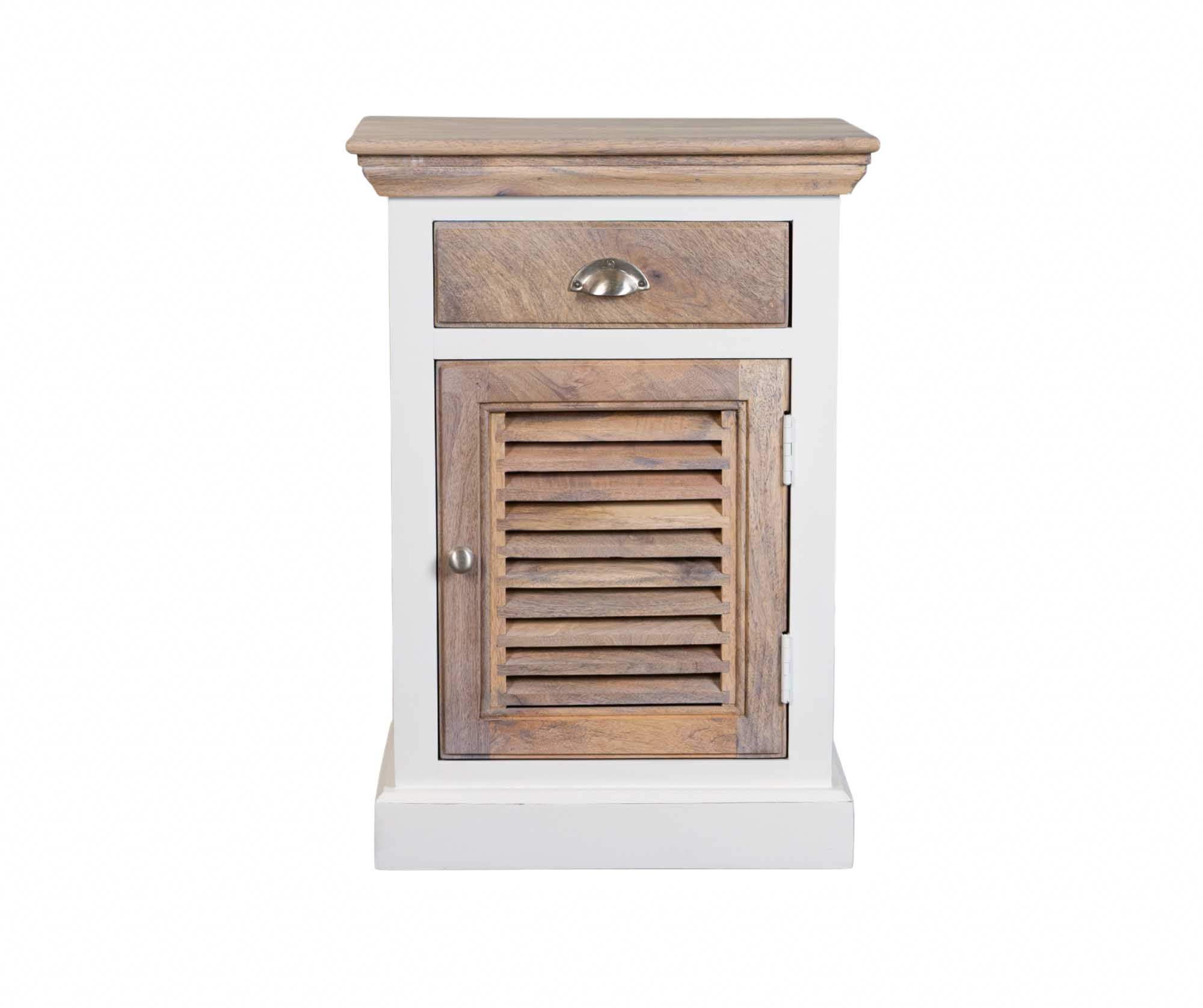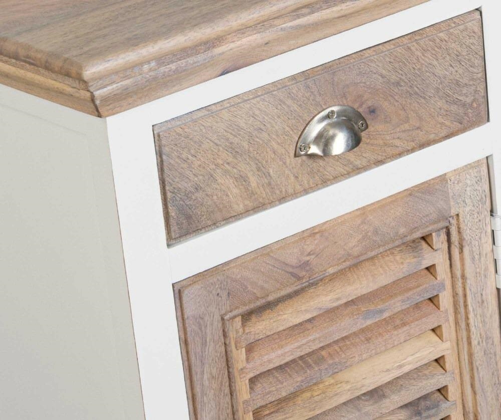 Mebel wykonany został z naturalnego drewna mango i akacji oraz płyty MDF. Korpus pokryty antyczną bielą, a blat i fronty w naturalnym kolorze drewna tworzą harmonijną kompozycję. Wyjątkowy charakter podkreślają fronty typu shutters (żaluzjowe) oraz klasyczne metalowe uchwyty. Subtelne przetarcia i nierówności kolorystyczne powstałe w procesie ręcznego malowania nadają każdemu egzemplarzowi unikalny wygląd.