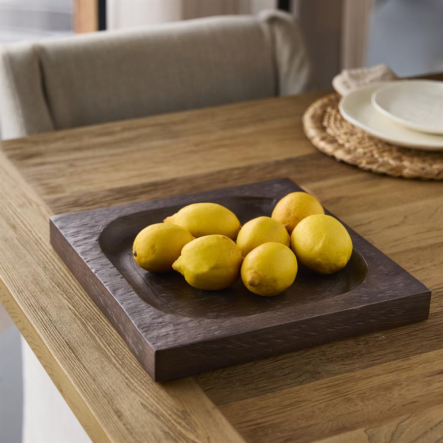 Produkt wykonany został z wysokiej jakości drewna mango, które wyróżnia się trwałością oraz pięknym, naturalnym usłojeniem. Głęboki, brązowy kolor podkreśla autentyczność materiału i nadaje całości ciepłego, przytulnego charakteru. Ręcznie wykończona forma z delikatnym wgłębieniem sprawia, że Taca Banu Riviera Maison prezentuje się niezwykle stylowo i oryginalnie. Wymiary: 34,5 cm długości, 34,5 cm szerokości oraz 4 cm wysokości zapewniają wygodę użytkowania.