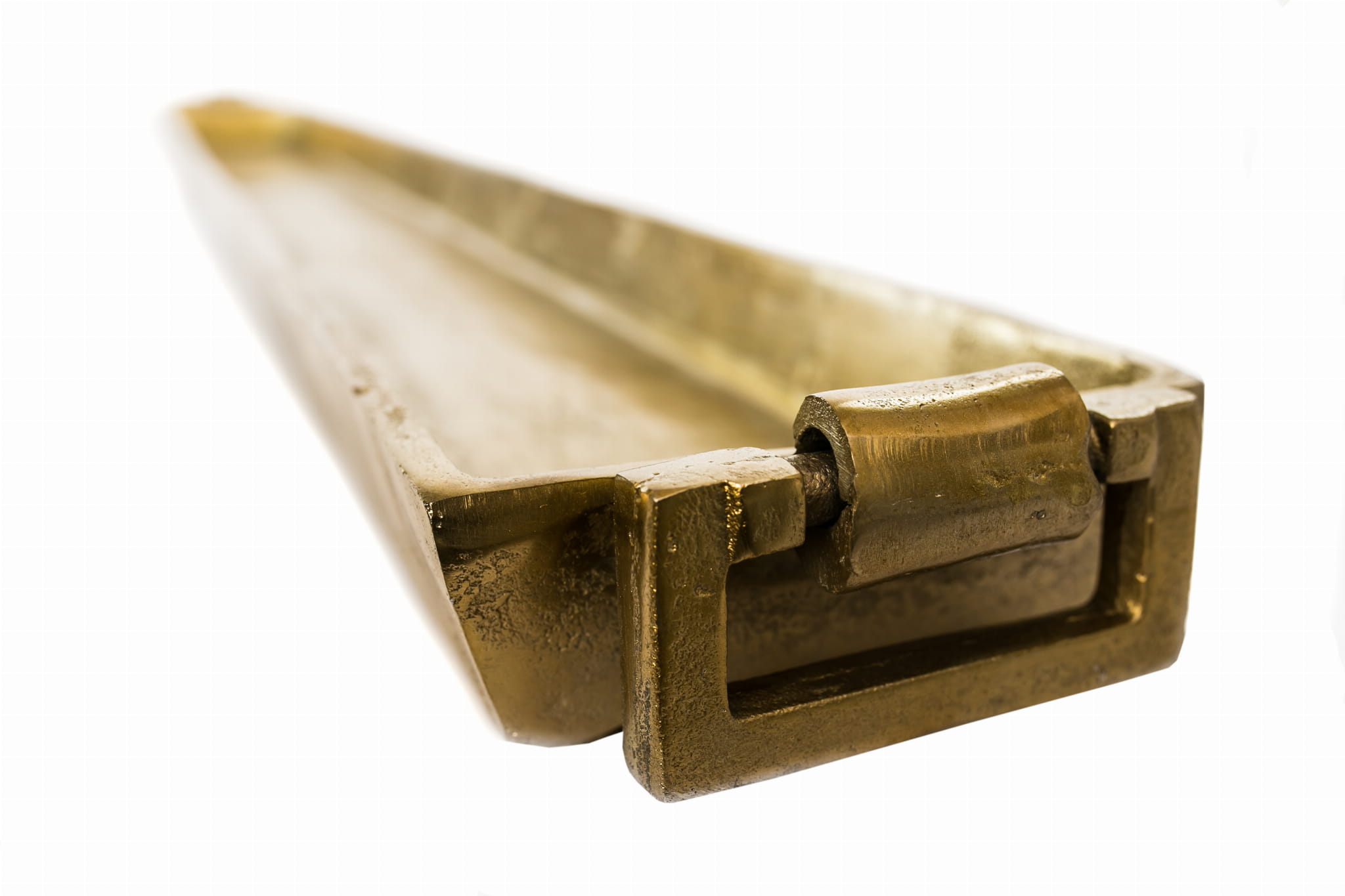 Taca Luiggi wykonana została z metalu o nieregularnej fakturze, co dodaje jej charakteru i podkreśla artystyczny styl. Efekt postarzenia nadaje jej wygląd ręcznie kutego przedmiotu, który wpisuje się w estetykę rustykalnego luksusu. Uwagę przyciągają metalowe kołatki na obu końcach, które pełnią rolę dekoracyjną oraz praktyczną – ułatwiają przenoszenie i dodają całości wyjątkowego charakteru.