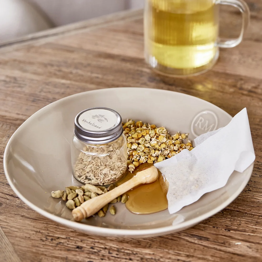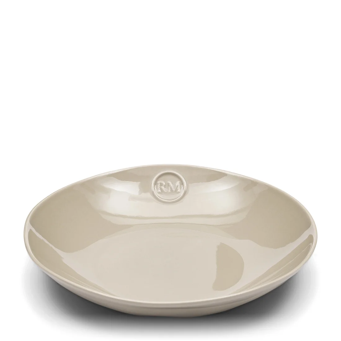 Talerz wykonany został z solidnej ceramiki o delikatnie nieregularnej formie, co dodaje mu rękodzielniczego charakteru. Powierzchnia pokryta została gładkim, błyszczącym szkliwem w odcieniu ciepłego beżu, który idealnie wpisuje się w naturalne trendy aranżacyjne. Wytłoczone logo RM (Riviera Maison) na ściance talerza dodaje elegancji i podkreśla markową jakość.