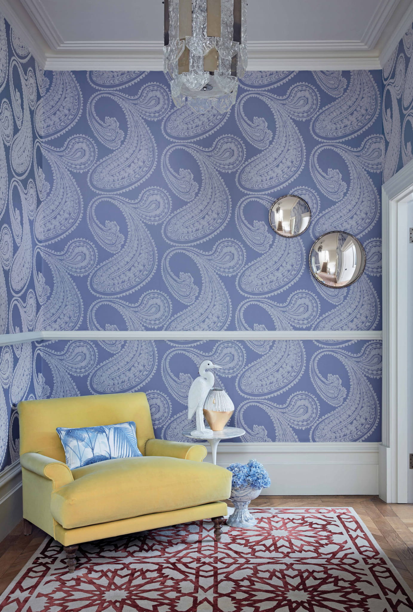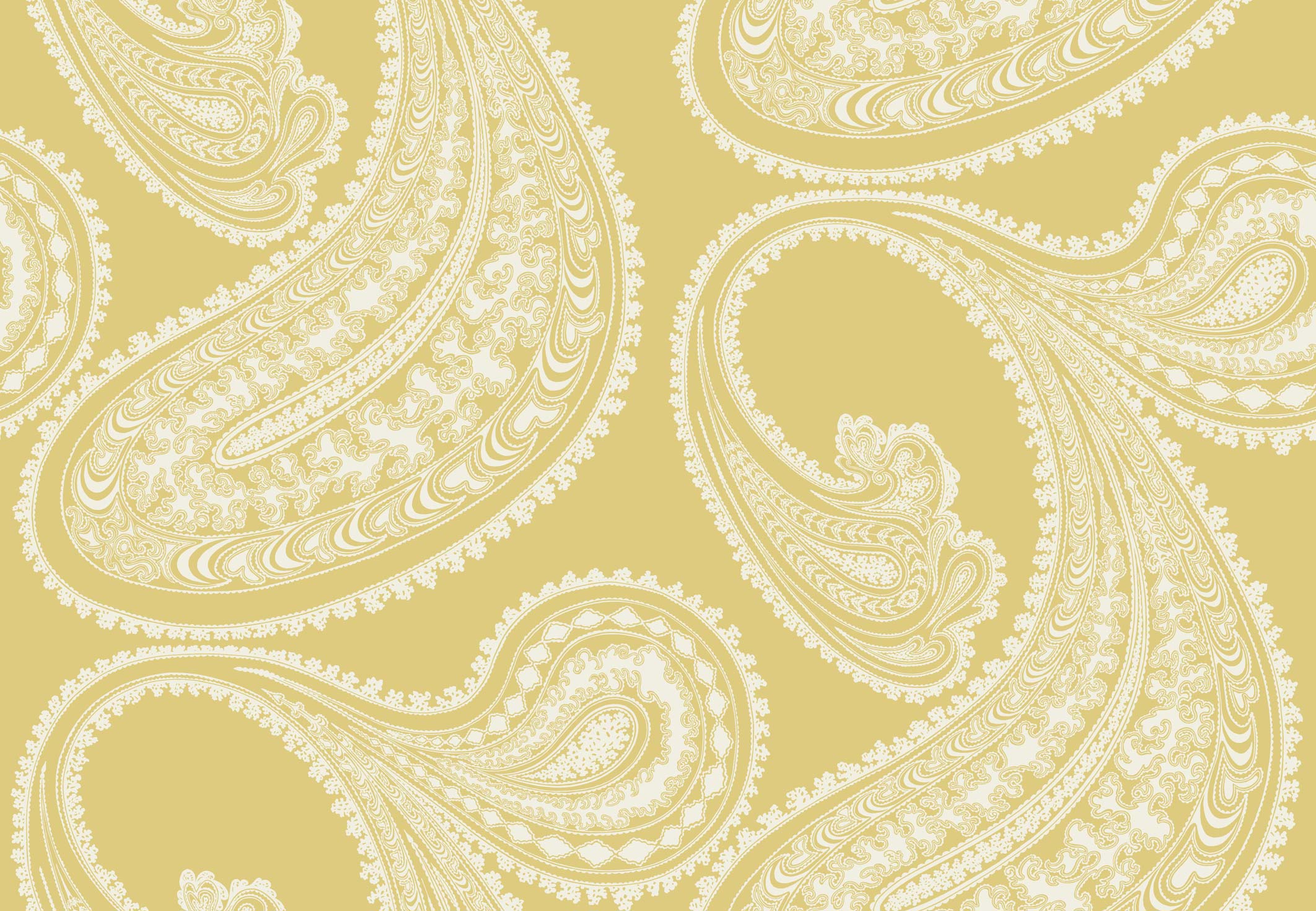Tapeta w przeskalowany wzór paisley w białym kolorze na żółtym tle, wprowadzi do wnętrza niepowtarzalny klimat z nutką retro. Dodatkowo wzór jest teksturowany ozdobnym flokiem.