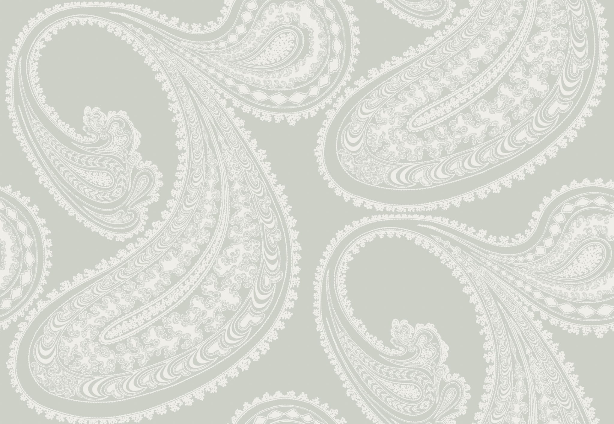 Tapeta w przeskalowany wzór paisley w pastelowym odcieniu oliwki na białym tle, wprowadzi do wnętrza niepowtarzalny klimat z nutką retro.