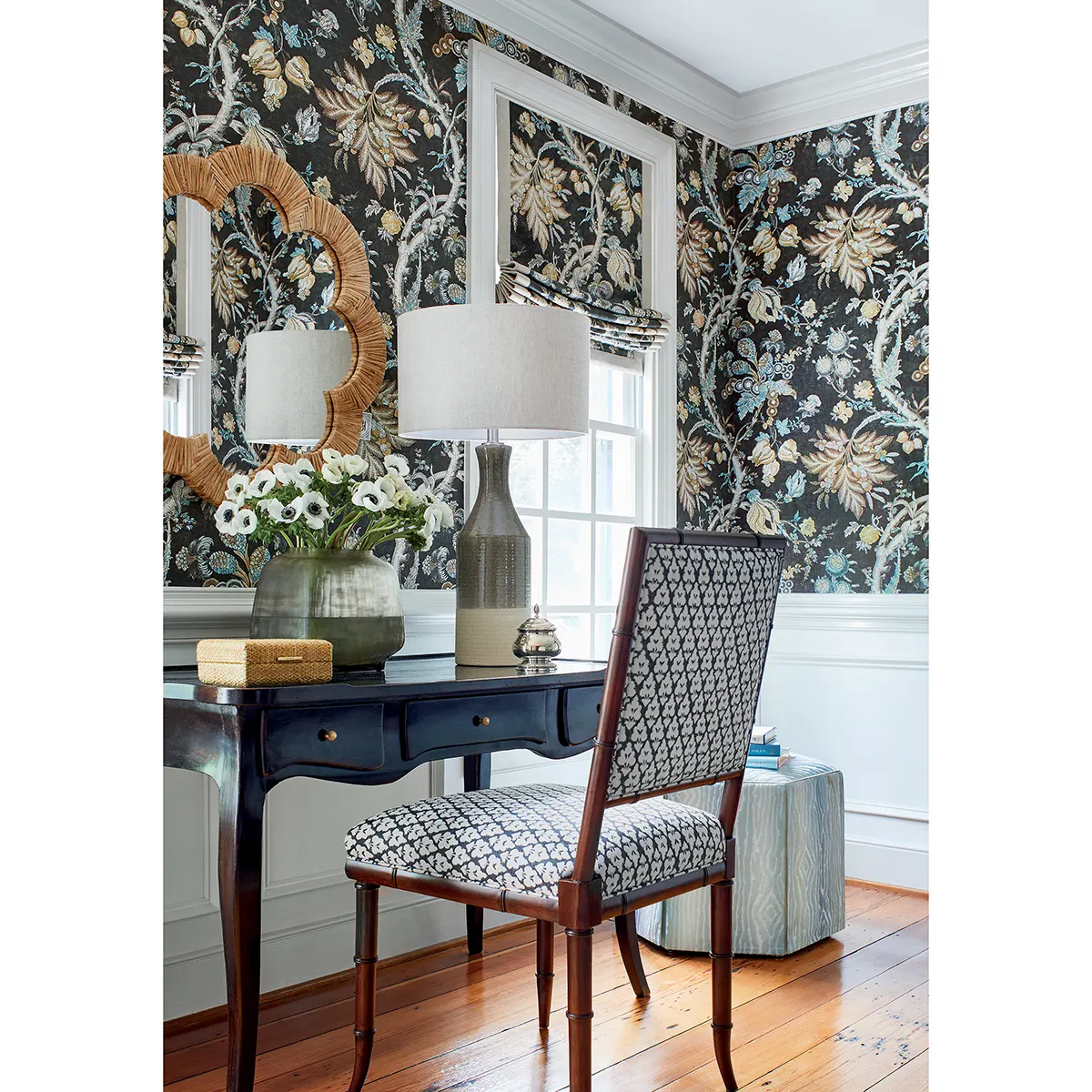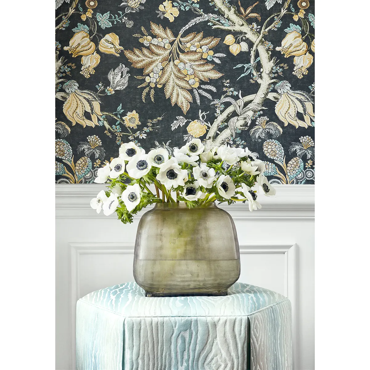 Reprodukowany na podstawie francuskiego dokumentu z końca XIX wieku, Chatelain przedstawia fantazyjne motywy kwiatowe jakobejskie zabarwione na głębokie, bogate odcienie. Ten bujny, wielkoformatowy kwiat jest kwintesencją wzoru drzewa życia.
