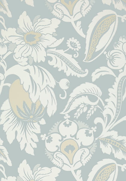 Tapeta Mallorca to przepiękna kompozycja kwiatowa w odcieniach rozwodnionego błękitu i bieli. Rozbudowany motyw kwiatowy w delikatnej kolorystyce doda wnętrzu barokowego przepychu.