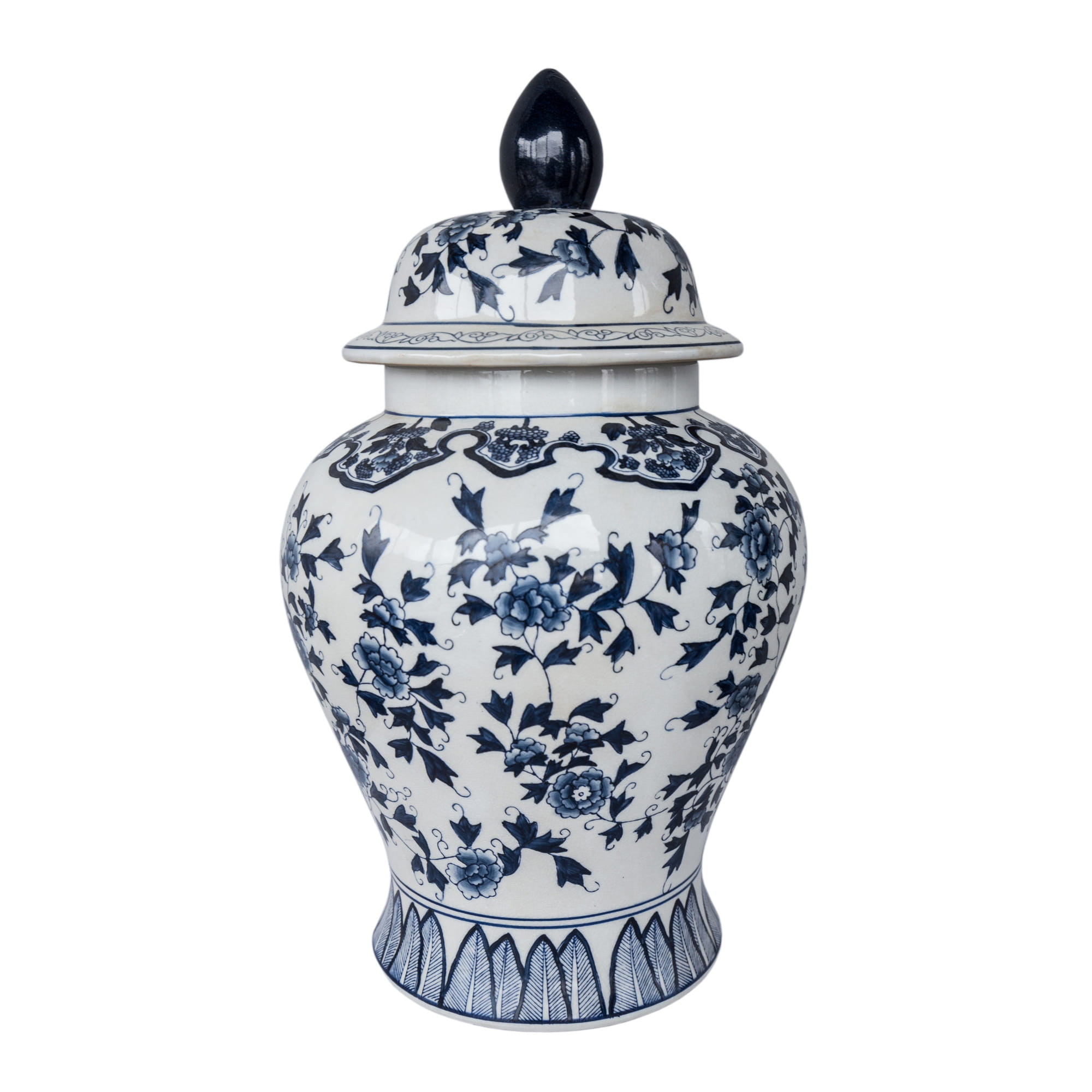Waza Jacobean to duża, klasyczna waza ceramiczna w stylu Hamptons w kolorze kremowej bieli zdobiona kwiatowym dekorem w kolorze granatowym.