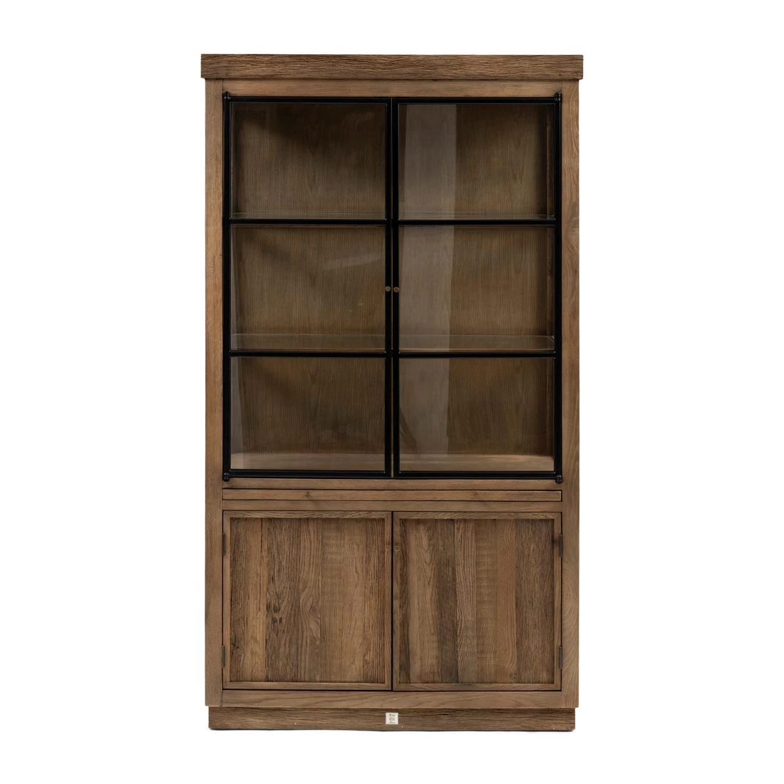 Charakterystycznym elementem tej szafki jest przeszklona górna część, elegancko osadzona w solidnej, czarnej metalowej ramie. To idealne rozwiązanie dla tych, którzy pragną wyeksponować swoje ulubione przedmioty czy kolekcje, dodając jednocześnie nutę nowoczesnego designu do swojego wnętrza. Dolna część zawiera zabudowane drzwi, które umożliwiają dyskretne przechowywanie przedmiotów, jednocześnie zachowując spójność stylistyczną.