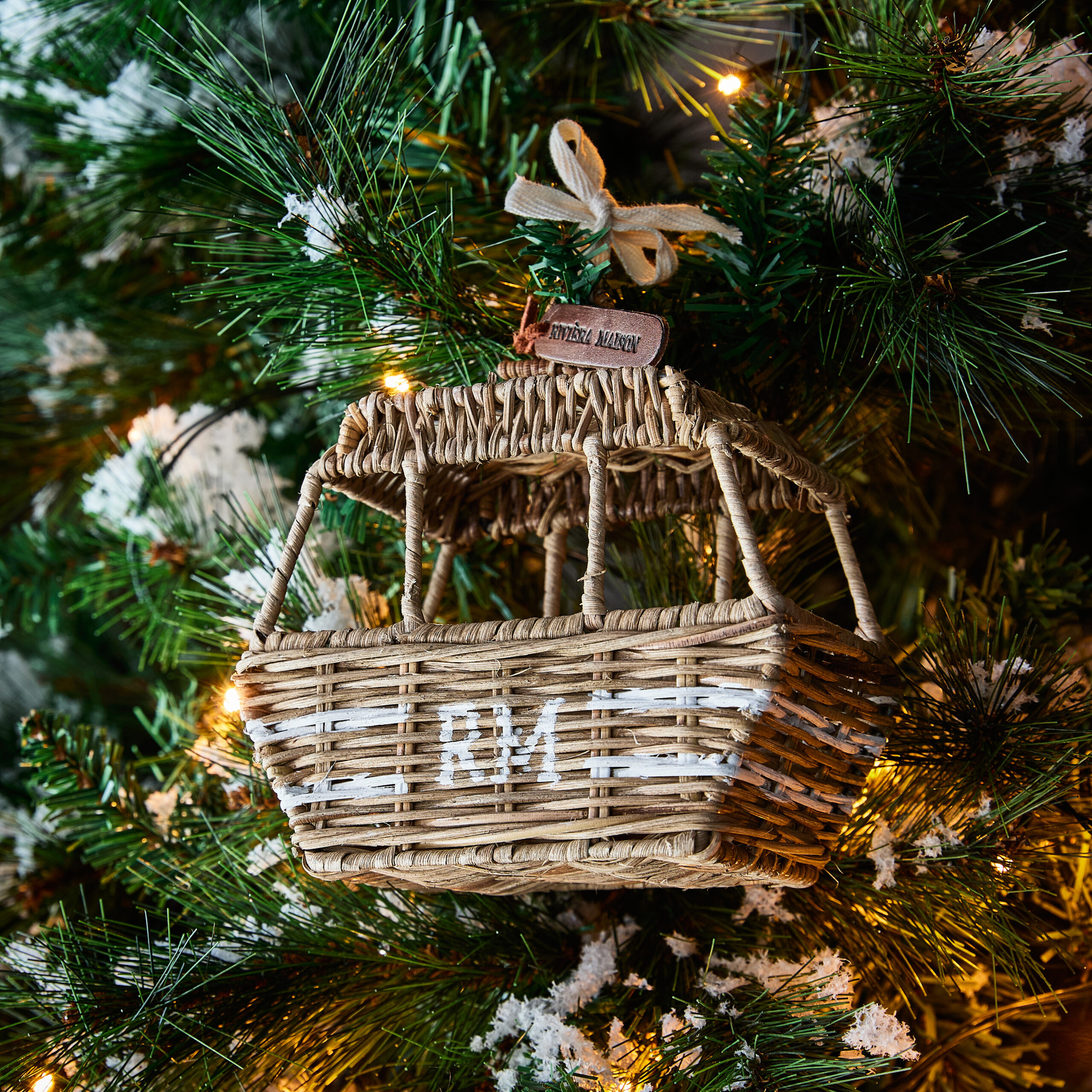 Każdy detal tej zawieszki został starannie zaprojektowany – od konstrukcji przypominającej miniaturowy wagonik, po malowane na biało oznaczenia RM oraz skórzany element z logo Riviera Maison. Uroku dodaje również bawełniana tasiemka służąca do zawieszenia. Dzięki użyciu rattanu dekoracja zyskuje lekkość i subtelność, a jednocześnie stanowi wyrazisty akcent na choince lub w świątecznej kompozycji.