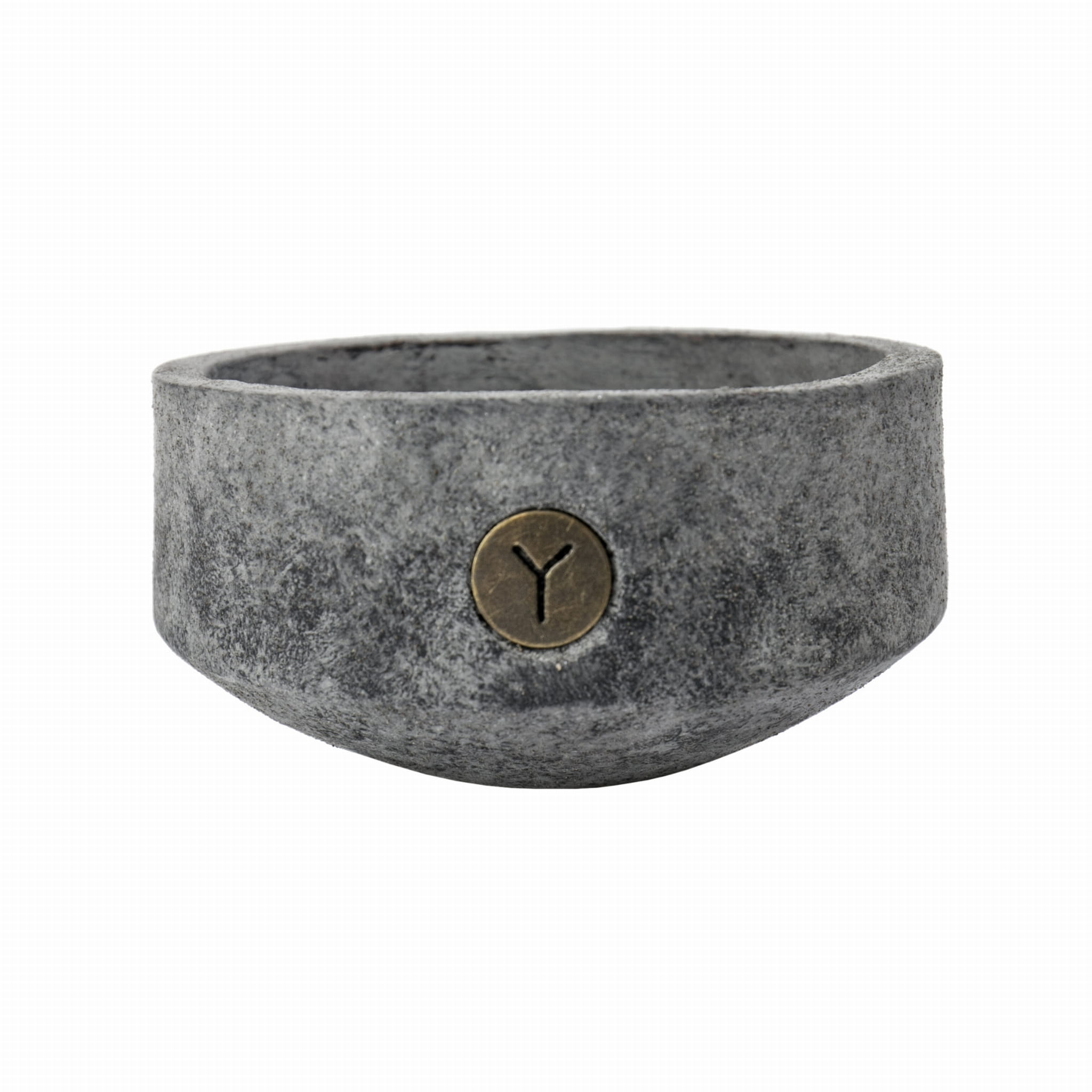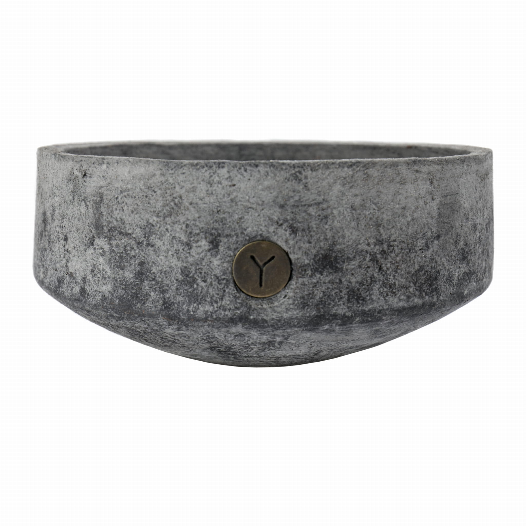 Donice wykonano z kompozytu o strukturze betonu, co zapewnia im wyjątkowy wygląd i wysoką trwałość. Matowa, szaro-czarna powierzchnia o nieregularnej fakturze imituje naturalny kamień, nadając każdej z donic rękodzielniczego charakteru. Ozdobny detal w postaci metalowego emblematu z symbolem Y nadaje całości nowoczesnego wykończenia. Kompaktowe wymiary mniejszej i większej donicy sprawiają, że zestaw można łatwo dopasować do różnych przestrzeni.