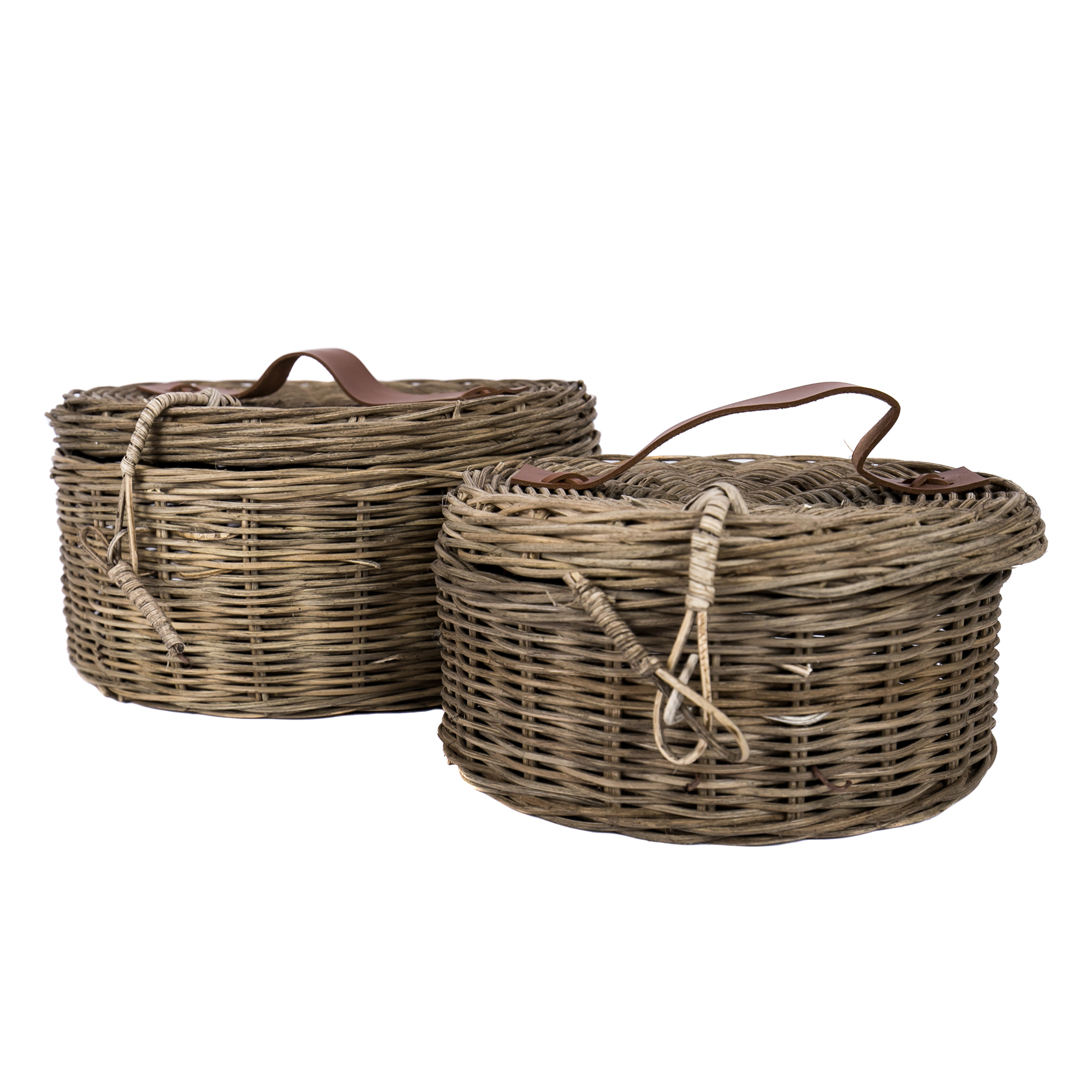 Oba kosze zostały starannie wykonane z naturalnego rattanu, który zachwyca autentyczną fakturą i ciepłym, naturalnym kolorem. Charakterystyczny splot nadaje im unikalnego uroku, a skórzane detale i zapięcia w formie rattanowego sznurka podkreślają dbałość o każdy detal. Okrągły kształt i wymiary: 25 cm i 32 cm średnicy oraz 14 cm i 16 cm wysokości sprawiają, że kosze pomieszczą wiele drobiazgów, nie zajmując przy tym dużo miejsca.