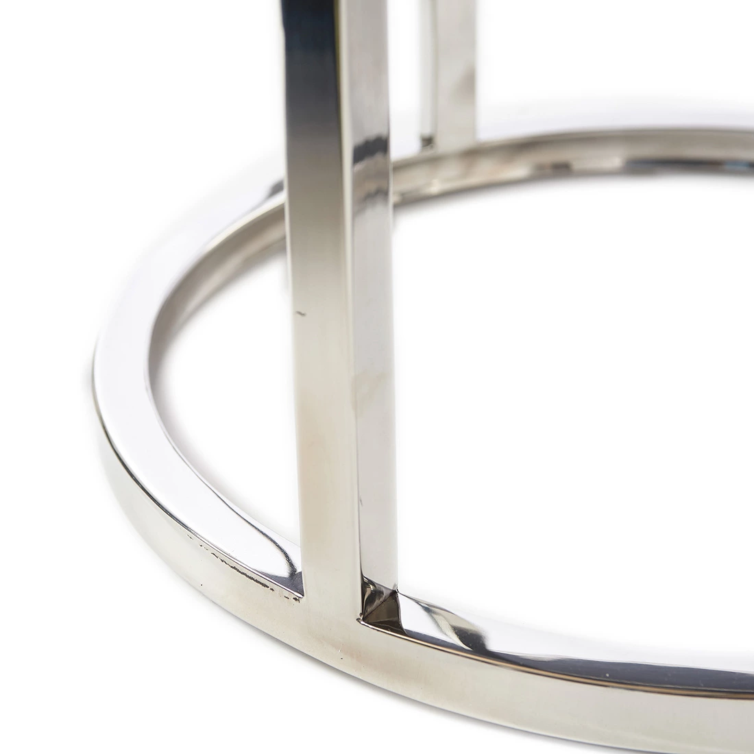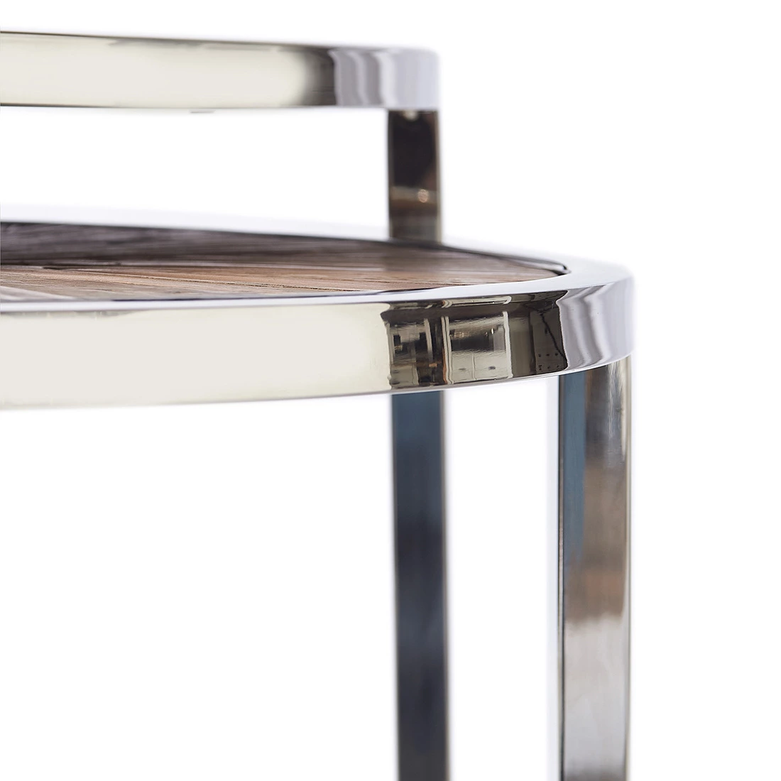 Blaty stolików wykonano z recyklingowanego drewna, które posiada naturalne ślady użytkowania, pęknięcia i nieregularne usłojenie. Dzięki temu każdy blat jest unikalny i emanuje rustykalnym urokiem. Drewno kontrastuje z ramą z polerowanej stali nierdzewnej, która nadaje całości nowoczesnego, eleganckiego charakteru. Ten duet materiałów podkreśla równowagę między naturą a nowoczesnością.